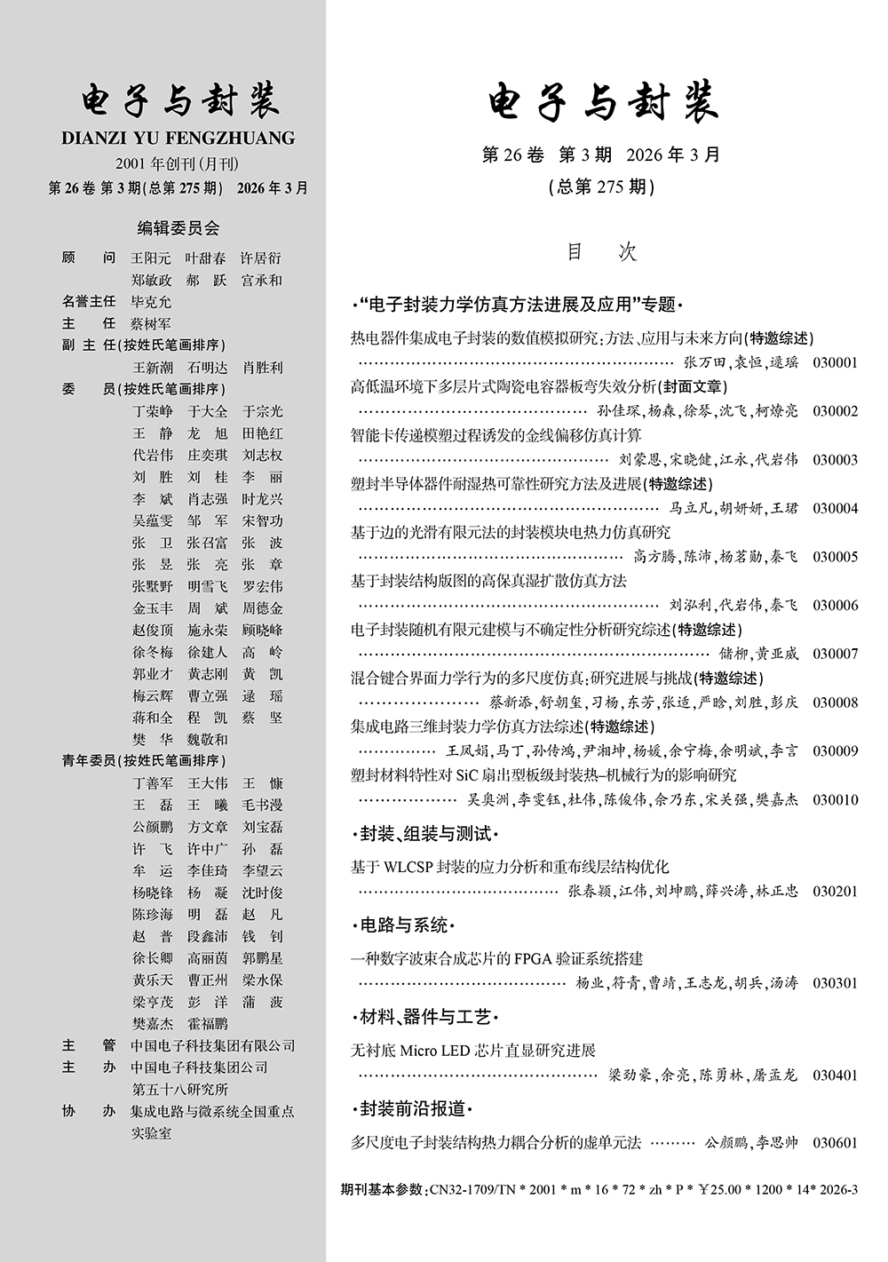 本专题收录的十篇论文从不同层面系统展示了电子封装力学仿真方法的最新进展。在基础理论方面,围绕先进互连结构中的界面力学行为与跨尺度耦合机制,深化了对微结构演化与宏观响应之间内在联系的认识,为关键失效机理分析提供了重要支撑。在方法发展方面,针对复杂封装体系多物理场耦合与多尺度特征所带来的建模挑战,相关研究提出了多种高精度数值方法与仿真策略,包括改进有限元方法、高保真湿扩散建模以及随机建模与不确定性分析方法,有效提升了仿真的准确性与稳健性。在工程应用方面,围绕典型封装结构与器件在热力耦合及复杂环境载荷下的服役行为,系统分析了材料性能、结构设计与可靠性之间的内在联系,为工程优化提供了重要依据。在工艺与新型封装问题方面,针对封装制造过程中产生的关键缺陷及新型器件集成中的多场耦合行为开展了深入研究,拓展了力学仿真方法在先进封装领域中的应用边界。上述研究在理论认知、方法创新与工程应用之间形成了紧密衔接,充分体现了电子封装力学仿真的综合性与前沿性。